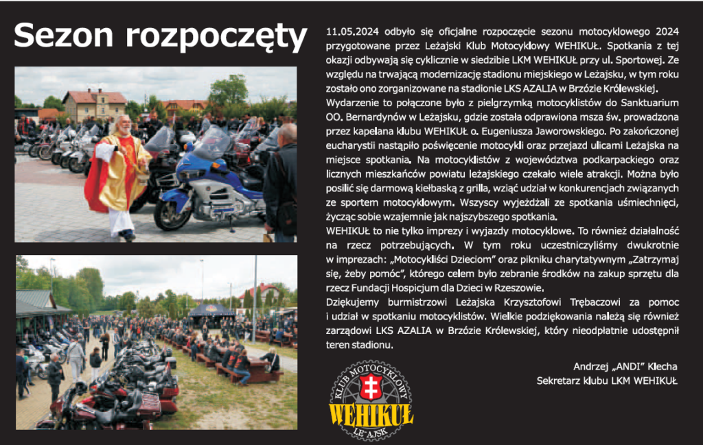 Aktualności Relacje „Wehikuł” w Biuletynie Miejskim przez Wehikuł|Opublikowano 2024-06-04 W Leżajskim Biuletynie Miejskim ukazała się wzmianka o rozpoczętym Sezonie Motocyklowym 2024 Całość do pobrania tu