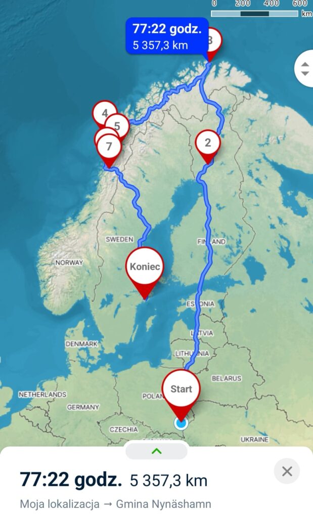 Ze względu na załamanie pogody zdecydowaliśmy, że skrócimy naszą wyprawę i udamy się pagórkowatą drogą E12 do Sztokholmu a dokładanie do Nynashamn gdzie wsiądziemy na prom, który przetransportuje nas do Gdańska. Mając na uwadze że przez 10 dni przejechaliśmy ponad 5800km ostatnie 650 km z Gdańska do Leżajska pokonaliśmy z wyjątkowym spokojem wiedząc że jesteśmy już „u siebie” a każdy kilometr przybliża nas do domu.